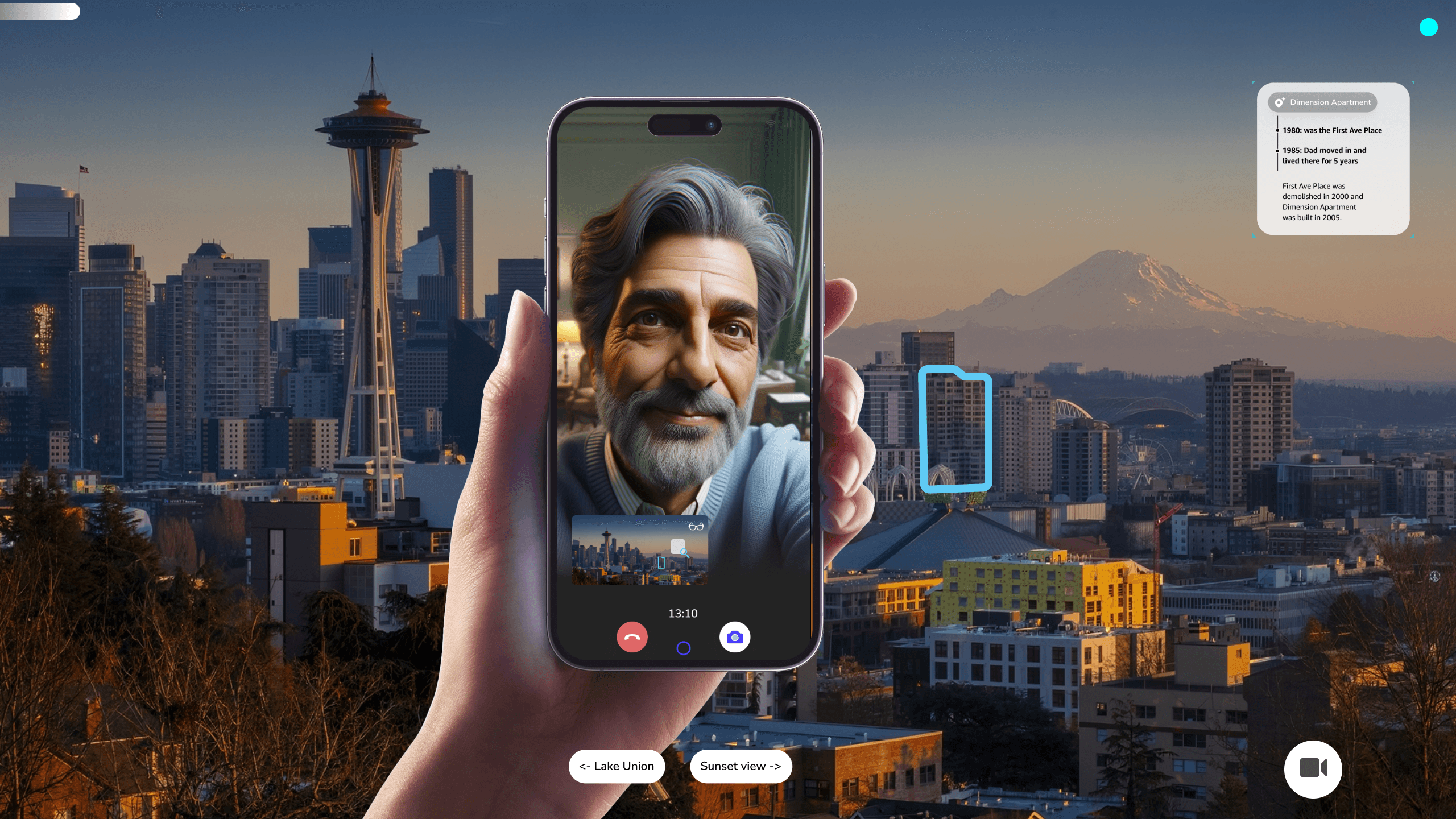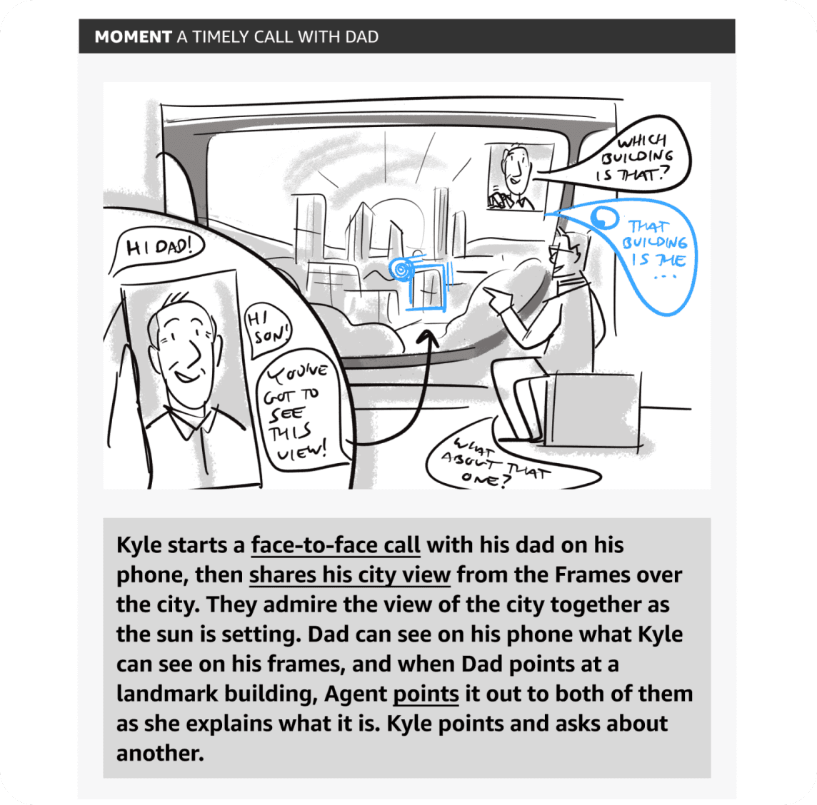 On a call with their dad, the customer shares their view using the glasses camera. The agent highlights a nearby building and adds details from a memory the dad had previously shared about living downtown.