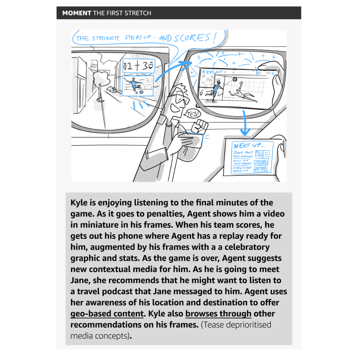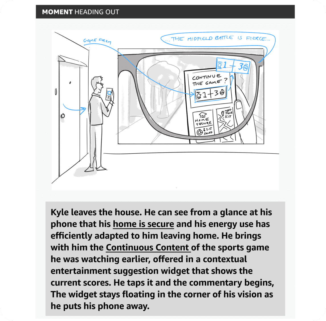 These high-level concepts (underlined below) are brought to life through scenarios. The scenarios ground each concept in a real-world story, making them easier to understand and evaluate. We stitched several concepts together to create a complete narrative. Illustrations by a coworker.